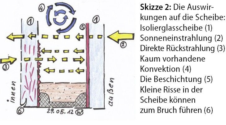 Hauptsächlich finden wir Schäden aufgrund von Schattenwirkung bei teilverdeckten Scheiben (z.B. durch Aufkleber etc.). Aber auch Vorhänge, Möbel und Schürzen von Heizkörperverkleidungen vor großen Fenstern können diese Schäden verursachen. Bruchgefahr besteht auch, wenn mehrere Scheiben auf Glasböcken übereinander gelagert werden. Dann gehen in der Regel die 2. bis 4. Scheibe zu Bruch.