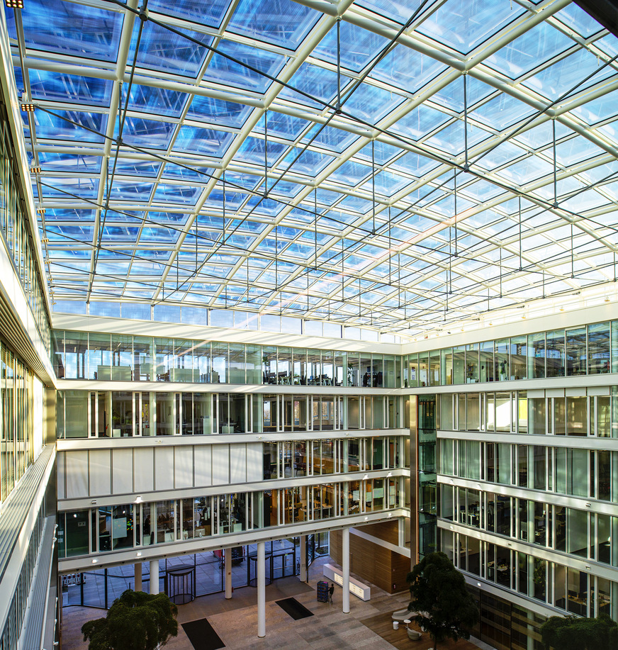 Im Newton bieten insgesamt etwa 35 000 m² Büroflächen in 65 Nutzungsmodulen für bis zu 2000 Menschen. Das Zentrum des Hauses und Forum für Veranstaltungen bildet eine glasüberdachte Halle. Zur Realisierung der Dachkuppel im Newton kam das Isolierglas Gewe-therm 4SG von Schollglas zum Einsatz.