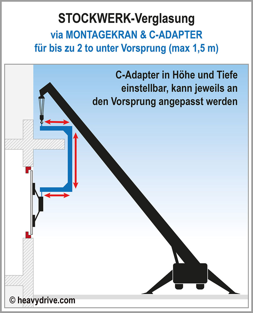 Der neue Heavydrive C-Adapter kann an jeden beliebigen Baukran angehängt werden und er hat eine Traglast von bis zu zwei Tonnen. Die horizontalen Arme sind ganz einfach mit wenigen Handgriffen entsprechend der Tiefe des Vorsprungs verlängerbar.