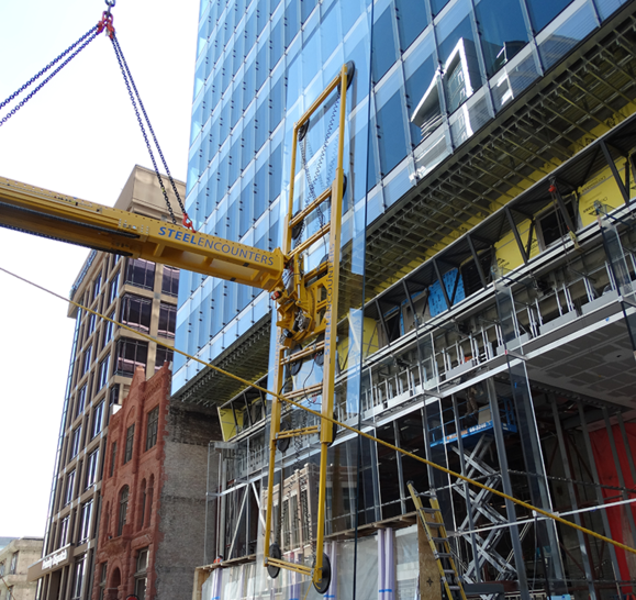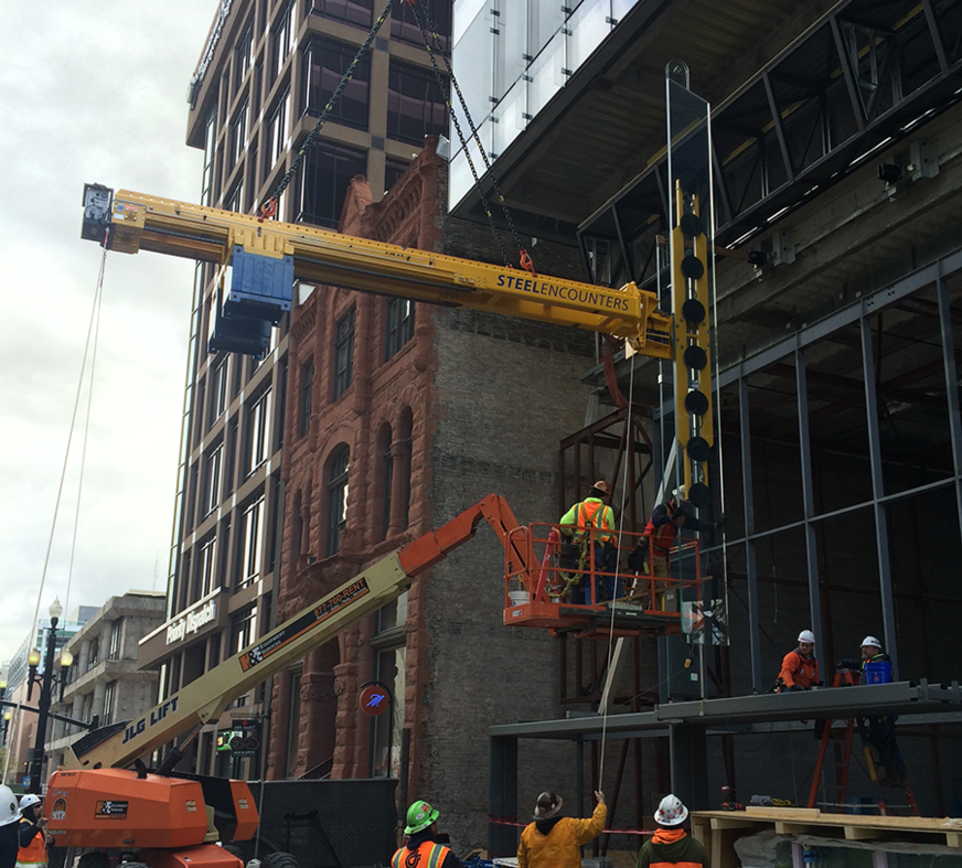 Die Anlagen überzeugten den Bauleiter dann auch vor Ort in Salt Lake City. Mit der Sauganlage VSG 3500 K in Kombination der Kontertraverse VSG 5000 konnten die Scheiben ohne Probleme unter den 3m tiefen Überhang gesetzt werden. Die Vakuum-Sauganlage VSG 1000 KL 9 ermöglichte die Montage der extrem schmalen und hohen Fin-Scheiben mit einem Gewicht von 860 gk ohne Probleme. Dank der winterfesten Saugteller (bis zu -20°C) gelang die Montage auch bei winterlichen Temperaturen zuverlässig und sicher.