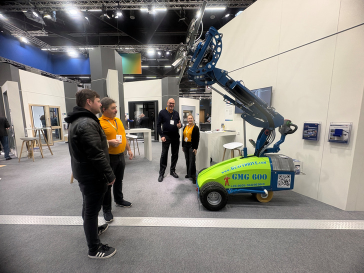 Im Fokus standen Themen wie Nachhaltigkeit, Energieeffizienz und Automatisierung. Anhand des kompakten Montageroboters GMG 600 demonstrierte Heavydrive, wie sich Glaselemente effizient und sicher von nur einem Bediener transportieren und montieren lassen. Der batteriebetriebene Roboter arbeitet emissionsfrei und eignet sich damit auch für den Einsatz im Innenbereich.