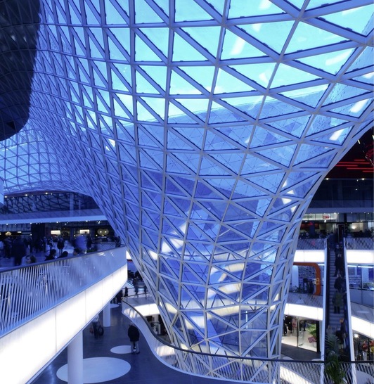 Weitere Projekte waren das Berliner Sony Center oder als eines der jüngsten Objekte die MyZeil-Galerie des italienischen Stararchitekten Massimiliano Fuksas in Frankfurt (Bild links und rechts). Dazu Heinrich Ross: „Bei der MyZeil waren die Anforderungen sehr hoch. Wir lieferten 3500 dreieckige Einzelscheiben. Und bei der Montage der Glasfassade kamen Bergsteiger zum Einsatz (siehe Infokasten). Aber der Aufwand hat sich gelohnt: der fließende Übergang von Innen und Außen ist ein besonderes Erlebnis.“