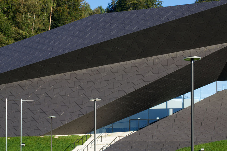 Die schwarze Fassade, inspiriert von der Erler Dornenkrone entstand in Hueck Trigon SG. Auch Fenster-, Türen- und Brandschutzsysteme von Hueck kamen in diesem einzigartigen Bauvorhaben zum Einsatz.