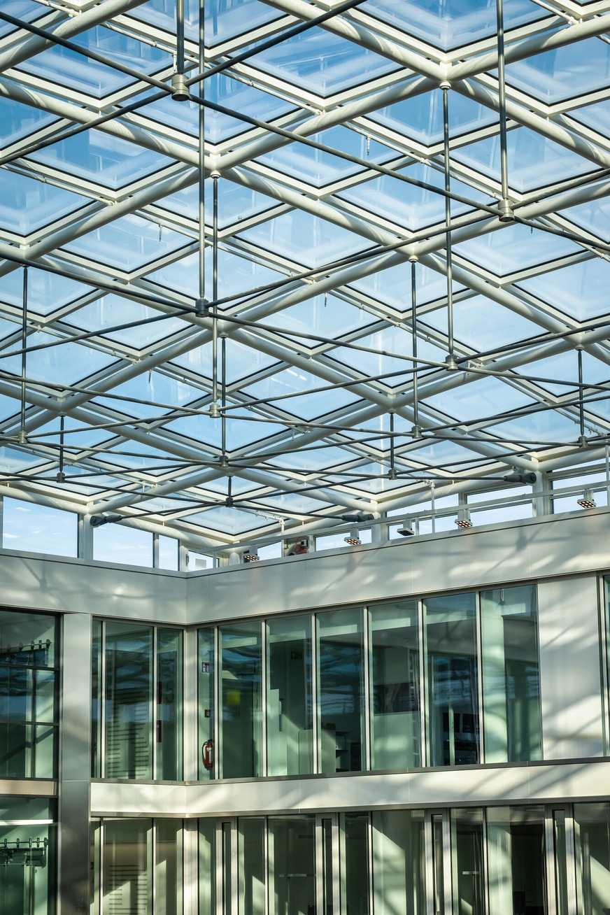 Lutz Jennermann: „Bei einer solchen Größe, wir reden von circa 31x31 m Tageslicht auf einem individuellen Stahlbau, ist das Lamilux Glasdach PR60 definitiv konkurrenzlos. Weder mit Lichtbändern noch mit Lichtkuppeln ist dieser Effekt, diese komplett verglaste Eingangshalle, technisch als auch ästhetisch machbar.“