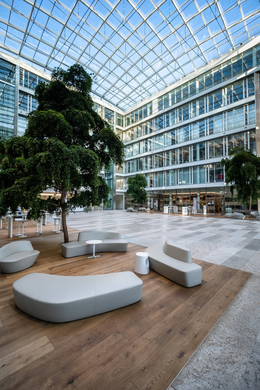 Architekt Franz Meier: „Wir wollten ein Bürogebäude kreieren, das zu einem Ort wird, zu dem die Menschen gerne gehen, an dem sie sich gerne aufhalten. Durch die überglaste Eingangshalle mit den Bäumen und die öffentlichen Bereiche ist uns das gut gelungen. Es ist einfach schön zu sehen, dass sich Menschen hier gerne in einem Gebäude aufhalten, da sie sich dort einfach wohlfühlen.“