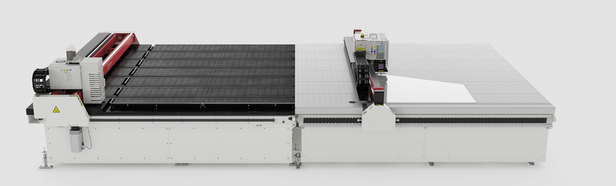 Die Arbeitsflächen der Lasermaschinen sind mit Luftsystemen und Gleitanschlägen für die Glaspositionierung ausgestattet und werden über Terminals gesteuert. Auf speziellen Wunsch ist auch eine kombinierte Maschine lieferbar, die beide Arbeitsschritte auf einem gemeinsamen Tisch erledigt.