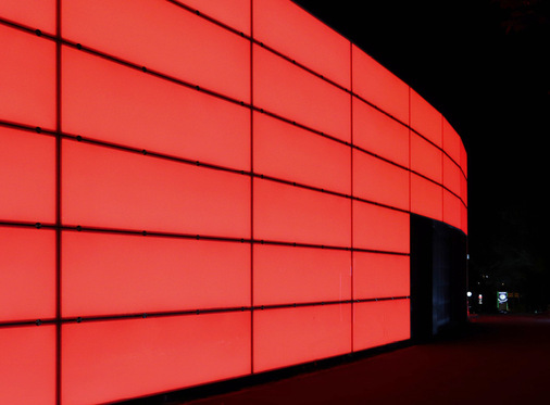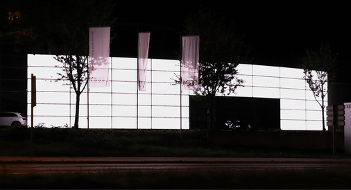 Die Glasfassade besteht aus einer Hauptfassade und vier Erkern, die beleuchtet werden können. Abends leuchten sie in weiß oder nach Wunsch des Bauherren in unterschiedlichen Farben, wobei es wichtig war, über die neue Fassade Botschaften zu vermitteln. Die eingebauten LEDscreen Elemente leuchten dabei homogen und sind in der Ansicht reflexionsarm.