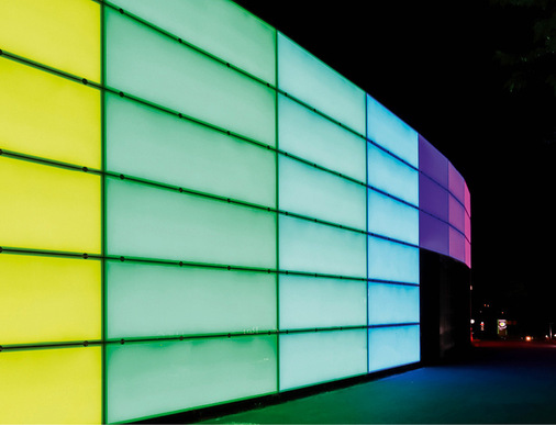 Das Licht wird dabei durch die gelaserte Struktur der Streuscheibe gleichmäßig verteilt, wobei die Vorsatzscheibe aus VSG flächig homogen hinterleuchtet wird. Der Glasaufbau ist hinsichtlich einer langen Funktionsfähigkeit sowie Dichtigkeit IP 65 geprüft. Die LEDs sind im Bedarfsfall wechselbar. Die größte Abmessung eines LEDscreen Elementes beträgt 3523 × 1060 mm.