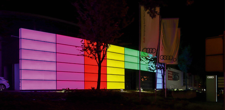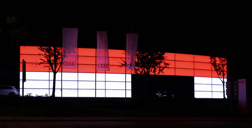 Zufriedene Nutzer: Christian Rittershaus, Centerleiter des Audi Zentrums Essen, ist begeistert von der Fassade mit smarten Leuchtelementen. „Bis jetzt haben wir nur positives Feedback erhalten. Insbesondere die Fassadenbeleuchtung mit den Flaggenmotiven kommt gut an.“