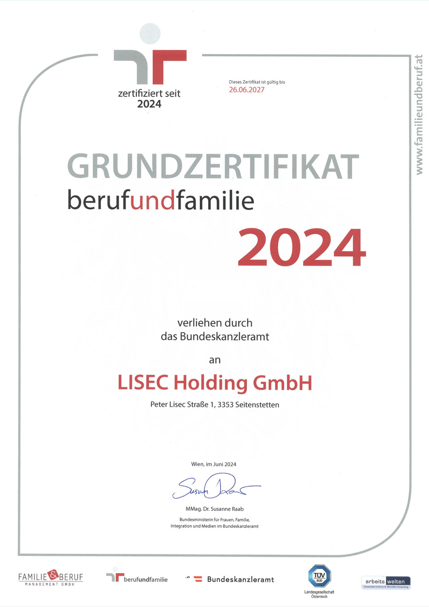 Die jüngste Auszeichnung mit dem staatlichen Gütezeichen „berufundfamilie“ bestätigt das Engagement von Lisec in diesem Bereich. Die Zertifizierung wurde von Bernadett Humer, MSc, Leiterin der Sektion Familie & Jugend im Bundeskanzleramt, überreicht.