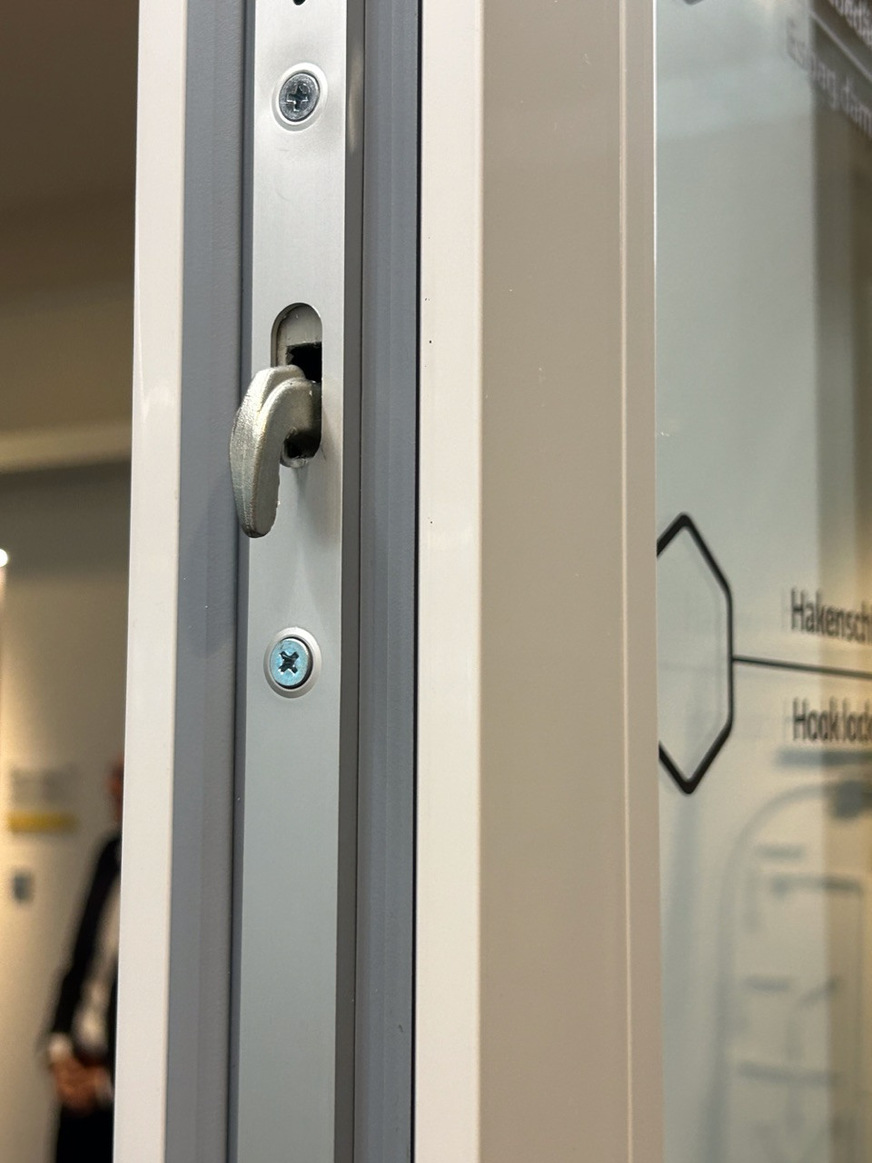 Im Eingangsbereich steht der Abstell-Beschlag Move in verschiedenen Einbausituationen. Das System mit Zentralverschluss und Macos Multi-Matic-Beschlag steht mit seiner durchgängigen Verschlusstechnik für hohe Dichtigkeit und großen Schiebekomfort bei wechselnden Bedienern. Weitere Schiebelösungen sind der Abstell-Schiebe-Beschlag SP comfort in einem Aluminium-Element, der mit seinem Komfort-Soft-Einzug mit Spaltlüftung überzeugt. Hinzu gesellt sich die Kipp-Schiebe-Lösung HKS comfort. Die modular erweiterbare Komfortlösung bietet ein paralleles Schieben sowie Kippen des Fensterflügels mit gedämpften Endlagen.