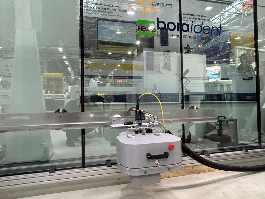 Was für mich noch sehr spannend war im Bereich Isolierglas: der mobile Laser von Hegla boraident. Damit lassen sich eingebaute Fassadengläser weiter upgraden, und beispielsweise mit Vogelschutzfunktion ausstatten. Der Laser wird außen an der Fassade angebracht und dann kann jede einzelne Scheibe entsprechend veredelt werden, bei laufendem Gebäudebetrieb.