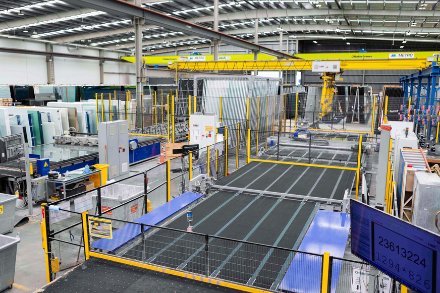 Von der Lagerung des Rohglases über das Schneiden bis hin zur Isolierglasfertigung kommen Lisec-Systeme zum Einsatz. Pufferspeicher, Krantechnik und Schneidtische sorgen für einen automatisierten Materialfluss und reduzieren manuelle Eingriffe.