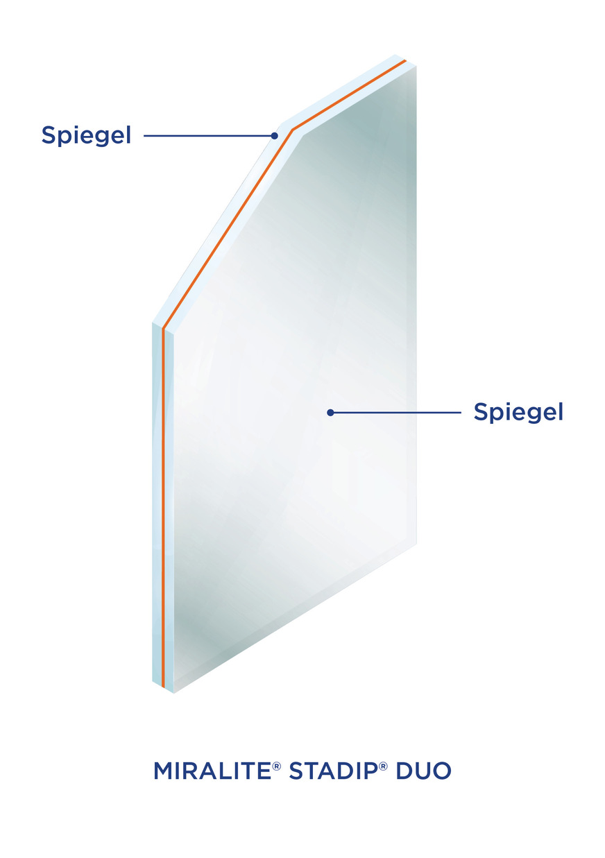 Eine Variante aus der Serie ist Miralite Stadip Duo mit beidseitigen Spiegelflächen, die Rücken an Rücken aneinander laminiert sind. Damit lassen sich zum Beispiel im Ladenbau verblüffende Raumsituationen kreieren: Doppelseitig spiegelnde Innentrennwände oder beidseitige Spiegelschränke im Bad erzeugen im Innenausbau ausgefallene Effekte und vermitteln räumliche Weite.