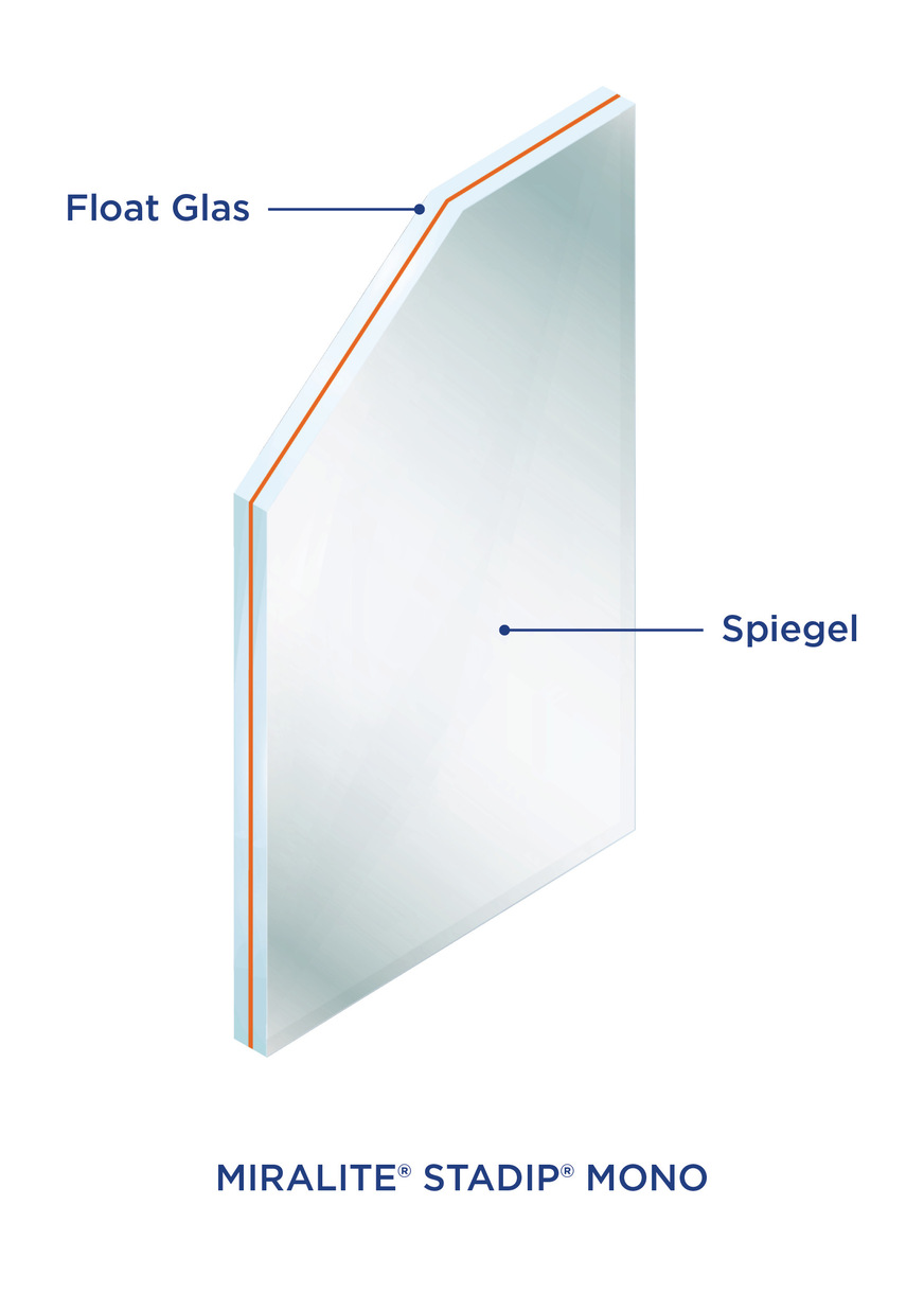 Für flächenbündige Wandspiegel kommt in Wohn- und Geschäftsräumen Miralite Stadip Mono als Kombination aus Spiegel- und Floatglas zum Einsatz, da hier ausschließlich die Funktion der Splitterbindung im Vordergrund steht.