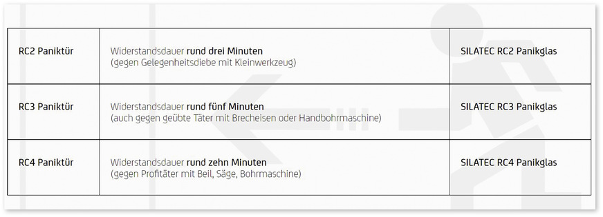 Zulässig ist dabei entsprechend nur Panikglas, z. B. vom Typ Silatec RC3 oder RC4 Panikglas, da das Glas, wie gesagt, mindestens so sicher sein muss wie die Tür (siehe Tabelle).