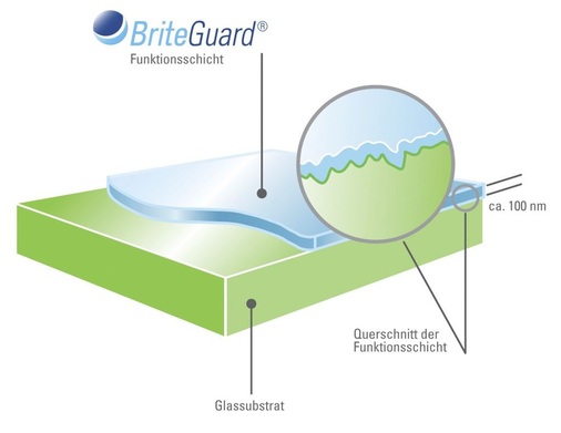 Nach der Applikation reagiert der BriteGuard Surface Sealer mit der Glasoberfläche und bildet eine hochfeste Funktionsschicht, die die Struktur des Glases oder der Glaskeramik nachbildet. Durch ihre sehr niedrige Oberflächenspannung sorge diese Funktionsschicht dafür, dass organische Verschmutzungen (z.B. durch Seife, Vogelkot oder Verkehrsemissionen) und anorganische Verschmutzungen (z.B. durch Kalk oder salzhaltige Luft) kaum anhaften und sehr leicht entfernt werden können. Sichtbar wird die niedrige Oberflächenspannung durch den bekannten Abperleffekt, der beim Kontakt mit Wasser entsteht.