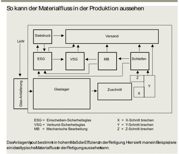 Sicher ist nicht für alle produzierten Gläser und Scheiben gleichermaßen der ideale Durchlauf umsetzbar, aber das Gros folgt einem vorgegebenen, logischen Weg, der durch die Maschinen- oder Abteilungsanordnung abgebildet sein sollte. Hat sich das Unternehmen auf eine bestimmte Produktpalette eingerichtet, ist der Aufwand, die Maschinen entsprechend in der passenden Reihenfolge aufzustellen, um einen technologisch „durchgängigen“ Fertigungsablauf zu erreichen, schnell wieder verdient.