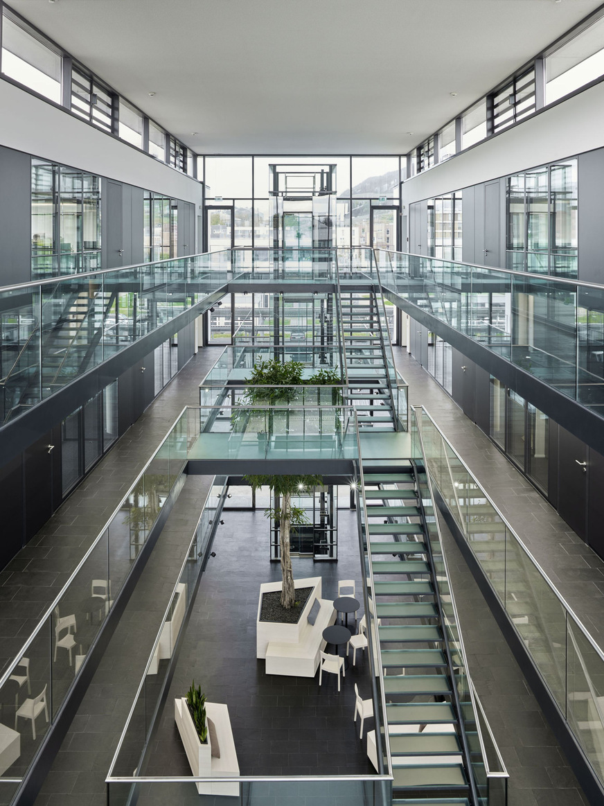 Dabei wurde die schon vorhandene Architektur noch einmal entscheidend aufgewertet. Vor allem die offene Gestaltung mit Atrium, Glastreppen und einem Glasaufzug verleihen dem Gebäude jetzt einen unverwechselbaren transparenten Charme.