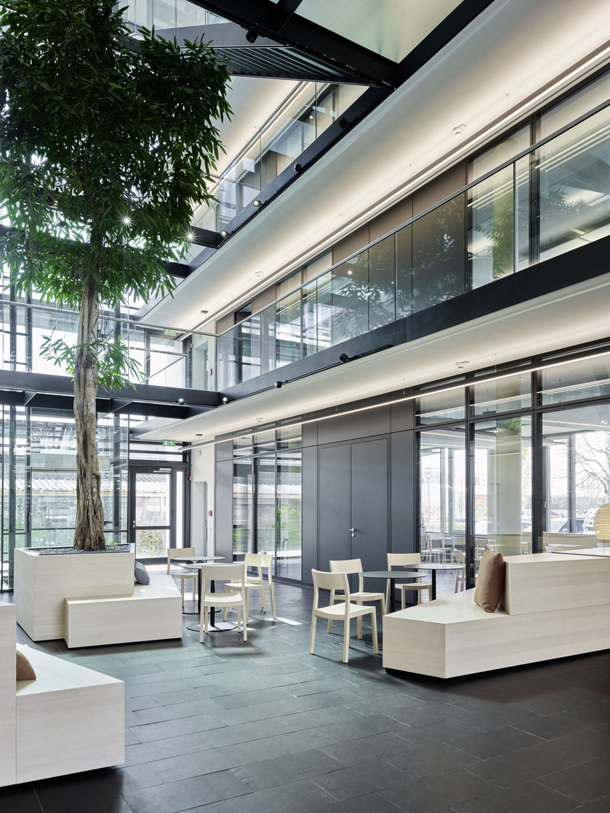 Die funktionale Umgestaltung wurde zudem den aktuellen Anforderungen an Materialien, Energieersparnis und Nachhaltigkeit gerecht. Ein besonderes Augenmerk wurde hier auf den Schall- und Brandschutz gelegt.