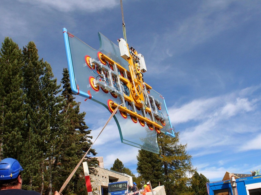 Zum Verlegen einer 2 Tonnen schweren Glasplatte in den Schweizer Bergen suchte die Monteure der Ruch Metallbau AG einen leistungsfähigen Vakuumheber.