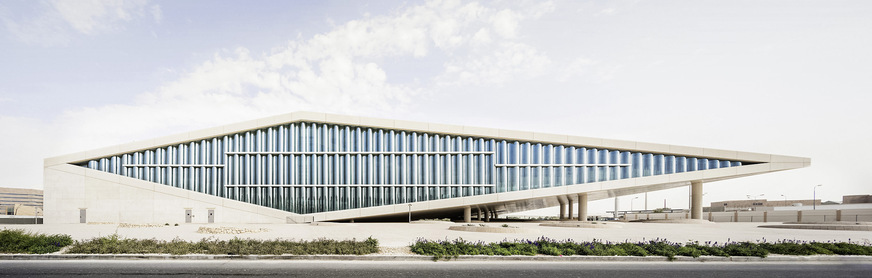 Beim Neubau der 138 m langen Bibliothek bilden die Glasfassaden die Form eines Diamanten, wobei die gewellten Gläser in Omega-Form ausgeführt sind. Sie filtern das gleißende Sonnenlicht und leuchten die Bibliothek mit möglichst viel diffusem, blendfreiem Tageslicht aus.
