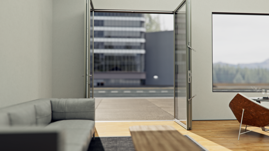 Mit Ansichtsbreiten ab 45mm bei der Flügel-Rahmenkombination wirkt sie trotz ihrer Robustheit sowohl in der ein- als auch in der zweiflügeligen Variante leicht und elegant. Selbst bei letzterer ist der Stulpbereich mit 60mm schmaler als ein aktuelles iPhone und ermöglicht Türhöhen von bis zu 2500mm. Für die komfortable Nutzung sind alle Bedienpunkte gut erreichbar, selbst bei der Maximalhöhe.