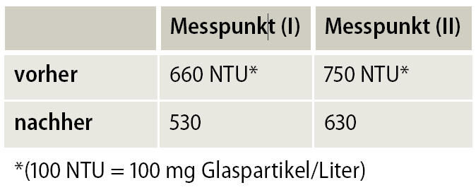 In der Tabelle sind die Ergebnisse anhand der Trübungsmessungen an den markanten Punkten (I am Zulauf, II am Rücklauf von den Schleiflinien) vor und nach der Realisierung der genannten technischen Maßnahmen dargestellt: