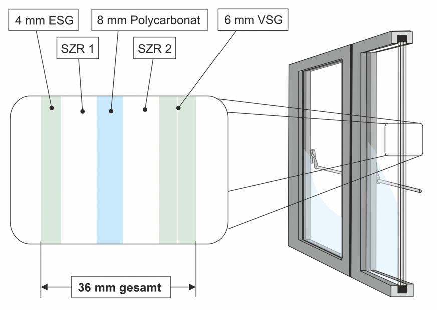 Auf der Angriffsseite wird 4 mm ESG eingesetzt während das 8 mm Polycarbonat als mittlere Scheibe für die Angriffshemmung sorgt.