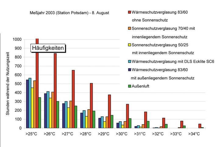 Auch nach Osten ausgerichtete Glasflächen ohne Sonnenschutz führen zu Überhitzung im Sommer, da am Morgen zu viel Energie in den Raum tritt. Die vormittags eingetragene Wärme bestimmt die Temperaturentwicklung im gesamten weiteren Tagesverlauf. Die Werte einer ausgeprägten Sonnenschutzverglasung mit innenliegendem Sonnenschutz sind hier zum Teil besser als die einer Wärmedämmverglasung mit Außenschutz. In der Ost-, Süd- und Westausrichtung werden mit einer Sonnenschutzverglasung mit Zusatzsonnenschutz im Innenraum Temperaturen erzielt, die denen eines Wärmeschutzglases mit Außenschutz (immer unter der Voraussetzung der adäquaten Nutzung) entsprechen oder darunter liegen.