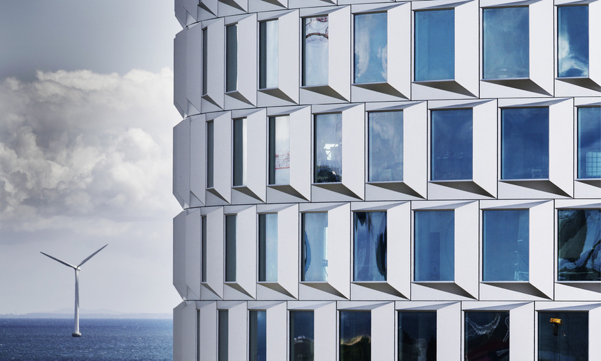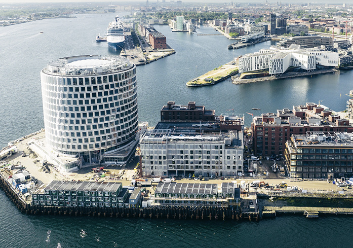 Darunter das von Vilhelm Lauritzen Architects und Cobe entworfene und demnächst fertiggestellte Bürohaus „Redmolen“: Kreisrund, 60 m hoch und mit Glas und galvanisiertem Stahl verkleidet, thront es an der Einfahrt zum Hafen. Pihl & Søn wickelt das Bauvorhaben als Generalunternehmen ab.