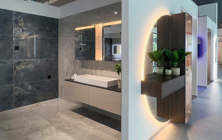 Zusatzfunktionen wie LED-Beleuchtung, Ambientelicht, Gestensteuerung, Smart-Home-Anbindung, Heizungen oder im Spiegel integrierte Fernseher werden immer häufiger nachgefragt, vor allem auch im hochpreisigen Segment. „Werden komplexe und aufwändige Spiegelsysteme gewünscht , liefern wir diese mit komplett integrierter Technik“, erklärt Kamps. „So kann der Verarbeiter seinem Endkunden innovative Lösungen anbieten, ohne selbst in neue Produktionsanlagen investieren zu müssen.“