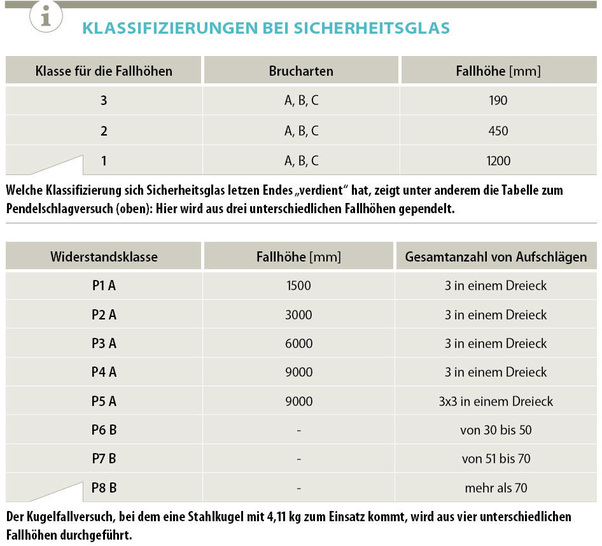 Doch wie lässt sich feststellen, was bestimmte Gläser im Bauwesen tatsächlich aushalten, also wie viel manueller Einwirkung sie standhalten können? Verschiedene Testverfahren, zur Klassifizierung von Flachglasprodukten hinsichtlich des Stoß- und Bruchverhaltens, geben Aufschluss.