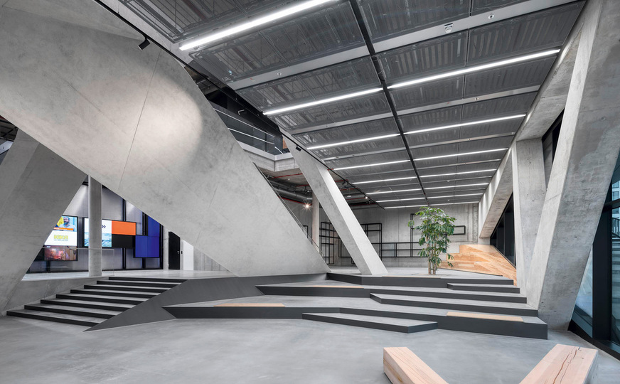 Im Bereich dieser Kommunikationsflächen führte feco außerdem Schrankelemente und Einhausungen für die Parkierung der mobilen Schiebewände aus. Die technische Gebäudeausstattung, Kabeltrassen und Leitungsführungen sind weitgehend sichtbar an der Decke geführt.