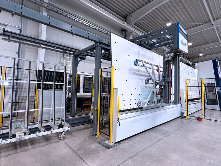 Die Scheiben werden automatisiert von L-Böcken aufgenommen und mittels optimierter Vakuumtechnik in die Produktionslinie übergeben. Dadurch wird ein zuverlässiges und schonendes Handling gewährleistet – auch bei empfindlichen Low-E-Beschichtungen. Neben rechteckigen Formaten können auch Sonderformen innerhalb dieses Bereichs verarbeitet werden.