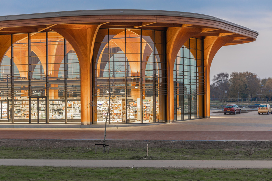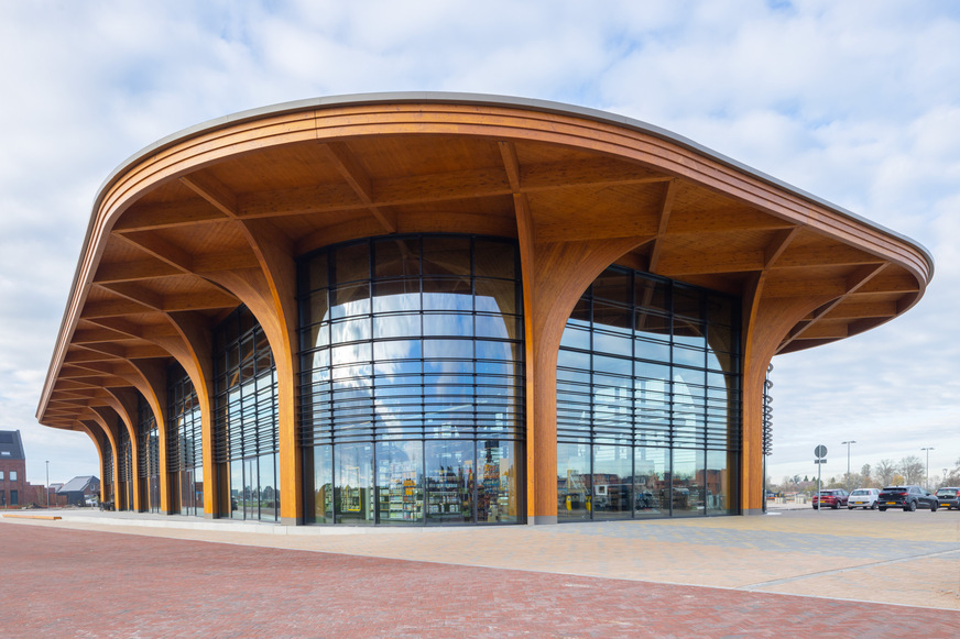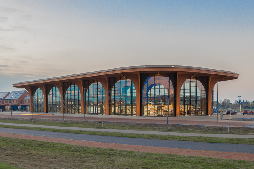 Der SuberHub Meerstad, errichtet aus Holz, Stahl und Glas ist eine Mischung aus einer klassischen Markthalle und einem modernen Einkaufszentrum. Die enormen geraden und gebogenen Verglasungen der Gebäudehülle stammen vandaglas.