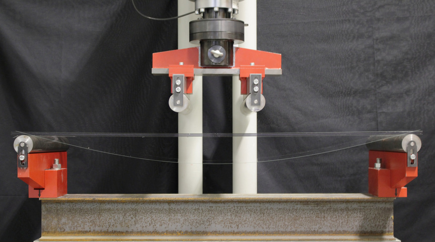 In Anlehnung an den Vierpunkt-Biegezugversuch zur Bestimmung der Festigkeit von Flachglas werden die Dünnglas-Polycarbonat-Verbundtafeln hinsichtlich des Schubverbunds untersucht. Dadurch ergeben sich Rückschlüsse auf das Trag- und Resttragverhalten sowie auf die Schubübertragung des Laminats.