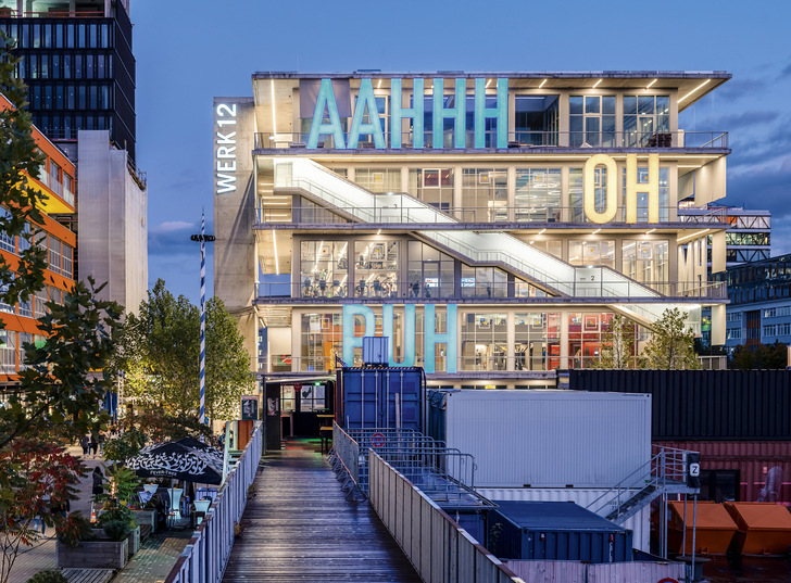Und genau dort haben die Rotterdamer Architekten MVRDV das Werk 12 errichtet. Mit seiner einfachen und klaren Form, der sparsamen Materialsprache und den transparenten Fassaden würde das fünfstöckige Gebäude an der Plaza kaum weiter auffallen – wären da nicht die breiten Terrassen, die jedes Stockwerk umgeben, und die Kaskadentreppen, die diese Terrassen miteinander verbinden.