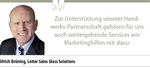Brüning – Zur Unterstützung einer erfolgreichen Partnerschaft gehören für uns auch weitergehende Services. Umfangreiche Verkaufsunterlagen, Musterkoffer und Ausstellungsmodule sind da im Grunde selbstverständlich. Bestellvorgänge werden durch die Nutzung unseres E-Shops besonders einfach. Eine Stufe weiter gehen wir mit unserem Web-Service, d. h. der Möglichkeit für die Verarbeiter, unsere Stammdaten direkt in ihre eigenen ERP-Systeme einzuspielen, für eine schnelle Artikelpflege. Besonders erwähnenswert ist sicher auch das neue Schulungskonzept. Unter dem Namen First Glass Experience sprechen wir sowohl die Verkaufspartner als auch die Montagepartner an. Die Schulungsmodule für die Monteure sind gestaffelt nach Komplexität in Basic, Professional und Expert. So vermitteln wir detailliertes Wissen zu unseren Produkten in Theorie und Praxis. Hier kann man also einen richtigen Wissensvorsprung in Produktkompetenz und Einbausicherheit erlangen und darf sich qualifizierter Montagepartner nennen.