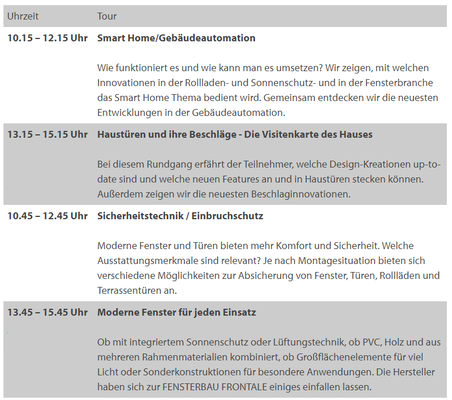 Die Gruppen werden von einem fachlich kompetenten Redakteur zu den Ausstellerständen geführt. Fachexperten der Hersteller stellen die neuesten Innovationen vor und beantworten die Fragen der Tourteilnehmer.