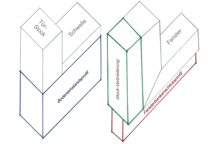 Bei der Montage von Außentüren und Fenstern werden häufig Profile zur Rahmenverbreiterung eingesetzt. Benötigt werden diese aus konstruktiven bzw. architektonischen Gründen. Im Schwellenbereich von Außentüren wird beispielsweise ein Bodeneinstandsprofil benötigt, um den Abstand zwischen Rohdecke und Tür zu überbrücken und die Schwelle an den Waldbildner anschließen zu können. Weitere Beispiele für Ergänzungsprofile sind das Fensterbankanschlussprofil, das bei der Montage von Außenfensterbänken zur Anwendung kommt, sowie Stockverbreiterungen, die für das Koppeln von Fenstern zu Bändern, über das Eck führen von Fenstern oder für die Montage des Sonnenschutzes benötigt werden.