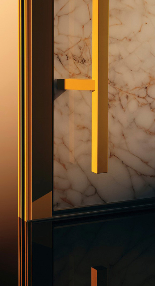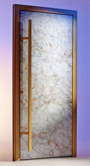 In der eigenen Glasfertigung von Finstral entstehen mit einem speziellen Glasdrucker nicht nur einfarbige Emaillierungen, sondern auch außergewöhnliche Motive wie das Steindekor. So werden besondere Blickfänge für den Eingangsbereich möglich: eine Haustür, die außen, innen oder beidseitig mit einer Steinoptik gestaltet werden kann. Der Kunde wählt aus neun Dekoren, die in natürlich wirkenden Farbabstufungen und Maserungen perfekt die Ästhetik edler Natursteine nachahmen. Auch diese Glasveredelungen werden im Härteofen der eigenen Glasfertigung realisiert.