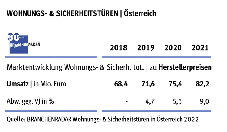 Die Nachfrage nach Wohnungseingangs- und Sicherheitstüren wuchs im vergangenen Jahr konstant um vier Prozent gegenüber Vorjahr. Die Verkaufspreise stiegen im Schnitt um knapp fünf Prozent. Laut aktuellem Branchenradar Wohnungs- und Sicherheitstüren in Österreich erhöhten sich dadurch 2021 die Herstellererlöse um neun Prozent gegenüber Vorjahr auf insgesamt 82 Mio. Euro.