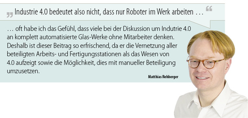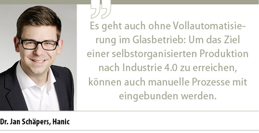 Wenn durch einen oder durch mehrere der hier genannten Gründe die Grenze für die Automatisierung erreicht ist, z. B. durch Begrenzungen des zur Verfügung stehenden Raumes oder weil die Maschinen schlicht nicht miteinander verknüpfbar sind, kann das Konzept der Industrie 4.0 in den glasverarbeitenden Unternehmen dennoch weiter umgesetzt werden.