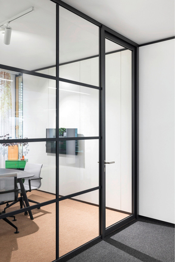 Wandintegrierte opake Glasflächen mit entspiegelter Oberfläche dienen als Whiteboards. Die Flurglaswand der Büros ist eine Einscheibenverglasung fecoplan mit 12 mm ESG und Rw,P = 37 dB.