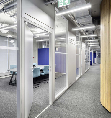 Geschlossene Wandoberteile nehmen als Vollwand fecowand die Überströmelemente fecoair auf und ermöglichen Leitungsdurchdringungen der sichtbar geführten Haustechnik. Die wandintegrierten Überströmelemente gewährleisten den Luftaustausch zwischen Büro und Flur und bieten gleichzeitig Schallschutz. Die Planung und Montage der Systemtrennwände in Baden-Baden übernahm die feco-feederle GmbH (www.feco-feederle.de.)