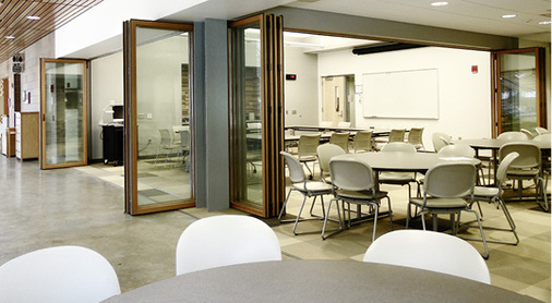 Auch Aufenthaltsräume, Cafeterien oder Gymnastikbereiche erhalten durch Raumteiler mit großen Öffnungsweiten mehr Flexibilität. Nach Bedarf lassen sich so große Hallen oder Räume für Therapiegruppen oder Veranstaltungen zusammenlegen oder trennen.