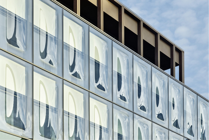 Der Blickfang in der Fassade ist jedoch die Fassadenfront im 2. und 3. OG: Dort setzen sich einzelne Scheiben mit speziellen Auswölbungen zu einer Ganzglasfassade mit einer markanten Rippenstruktur zusammen.