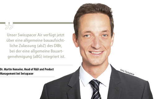 Dr. Martin Henseler – In der Zulassung ist der Fall einer offenen Mehrscheibenverglasung bislang nicht abgedeckt – weder EU-weit durch die CE-Kennzeichnung noch national durch die Ü-Kennzeichnung. Laut EN1279 müssen Isoliergläser geschlossene Systeme sein. Die Verwendung eines CE-Kennzeichens mit einem offenen System, wie beim Swisspacer Air ( www.swisspacer.com ), war nicht möglich. Um diesen Status zu ändern, haben wir eine allgemeine bauaufsichtliche Zulassung (abZ) beim DIBt beantragt und jetzt erhalten. In die abZ ist eine allgemeine Bauartgenehmigung (aBG) integriert, da auch Aspekte des Zusammenfügens, der Planung, Bemessung und Ausführung geregelt werden.