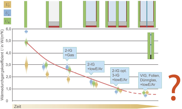_ Die Entwicklung der Wärmedurchgangskoeffizienten UW für Fenster wurde in der Vergangenheit stark durch die Entwicklung der Isoliergläser geprägt. Marktanalysen[1] zeigen, dass heute in Deutschland mehr als die Hälfte der hergestellten Fenster mit 3-fach-Isolierglas ausgeführt werden. Die Systemgeber der Rahmenprofile und Beschlaghersteller haben ihr Produktportfolio auf die dickeren und schwereren Glaspakete eingestellt.